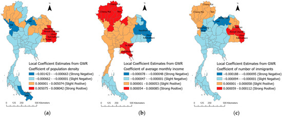 The areas with strong statistical fit are primarily located in northern and central Thailand, indicating a strong relationship between socioeconomic factors and property crime, as seen in provinces such as Chiang Mai and Bangkok. These areas, with deviance close to 0.966, suggest that local economic and social conditions effectively explain crime variations. In contrast, areas with low deviance (below 0.779, shown in dark purple) are primarily found in several southern provinces and in parts of the central region. These lower values imply that the selected socioeconomic predictors may not fully capture the complexity of crime determinants in these areas. One possible explanation is the influence of unobserved contextual or structural factors specific to these regions, such as political instability, religious tensions, or cross-border security issues, particularly in the southern provinces. Additionally, certain cultural or law-enforcement dynamics that differ regionally might also affect crime patterns and reduce the explanatory power of the model. To further understand these variations, the coefficients of each socioeconomic variable across the study area were explored, providing deeper insights into their spatial relationships with property crime in Figure 5.