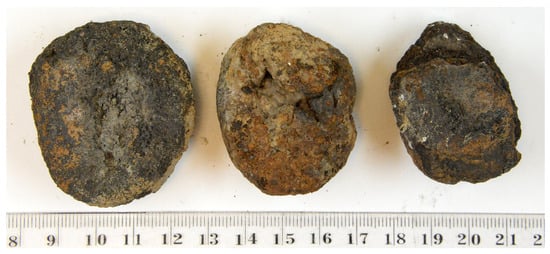 Polymetallic nodules are mineral-rich, potato-shaped concretions (see Figure 1) that form over millions of years on the ocean floor through the slow precipitation of metals from seawater and sediment pore water. These nodules are composed predominantly of manganese (25–30%) and iron (10–15%), along with economically significant concentrations of nickel (~1.3%), copper (~1.1%), and cobalt (~0.2–0.3%) [17,18]. They also contain trace amounts of rare earth elements, molybdenum, lithium, and other critical raw materials essential for green technologies, such as electric vehicle batteries, wind turbines, and renewable energy conversion systems [19].
