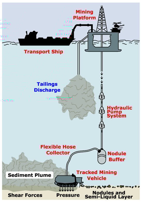 The technological challenges of deep-sea mining stem from the extreme conditions of the ocean floor and the complexity of developing reliable, efficient, and environmentally sustainable extraction systems. Operating at depths often exceeding 5000 m requires specialized equipment capable of withstanding immense pressure and low temperatures while maintaining functionality over extended periods [18]. The current mining technologies, as detailed in Section 3, face significant engineering hurdles, including wear and tear due to abrasive sediments, potential clogging of hydraulic and pumping systems, and difficulties in real-time monitoring and control [57].