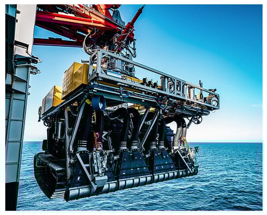 Their main part is an autonomous or remotely operated undersea vehicle designed to move across the deep-sea floor, collecting polymetallic nodules while minimizing environmental disturbance. The tracked or wheeled vehicle (such as the collector designed by the Allseas Group S.A. (Châtel-Saint-Denis, Switzerland), pictured in Figure 4 [37]) can intelligently navigate on the soft and uneven seabed, using sensors and cameras to map the terrain and optimize its movement.