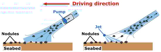 The collection mechanism can be either hydraulic or mechanical. Hydraulic systems employ water jets or suction pumps (utilizing suck-up collection or Coandă-effect-based technology, as shown in Figure 5) to lift the nodules, while mechanical collectors use rotating drums, conveyor belts, or rakes to scoop them up [39].