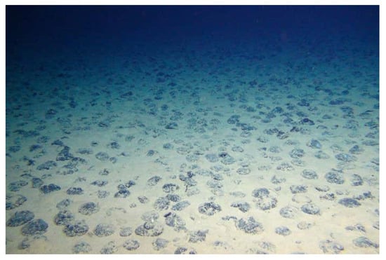 These nodules are found on abyssal plains at depths ranging from 4000 to 6000 m, typically lying loose on or just below the sediment surface. Despite widely varying estimates, it is universally acknowledged that the Clarion–Clipperton Zone (CCZ), located in the northeastern Pacific Ocean between Hawaii and Mexico, is the most prominent and extensively studied nodule deposit area. Spanning over 4.5 million km2, the CCZ contains approximately 21–22 dry Gt of polymetallic nodules, from which an estimated 260 Mt of nickel, 230 Mt of copper, 44 Mt of cobalt, and a substantial quantity (around 6 Gt) of manganese could potentially be extracted [17,22]. Based on this estimate, the tonnages of many critical metals in the CCZ nodules are greater than those found in global terrestrial reserves [23]. Almost all of these metals are on the list of critical or strategic raw materials [24,25].