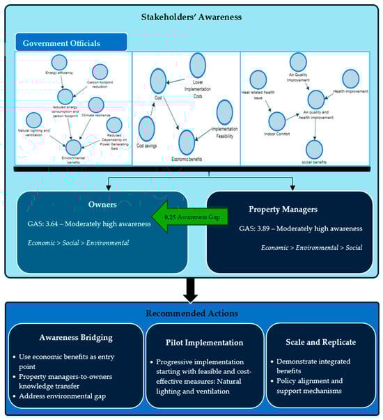 The economic benefit dimension received moderately high awareness scores from both property managers (4.03) and owners (3.99). For property managers, this reflects their operational role as intermediaries between homeowners and tenants who are tasked with maximising property value and operational efficiency. For owners, initiatives such as retrofitting require some cost, and they are more likely to subscribe if assured of increased return on investment, property value increases, and operational savings. These observations support Duan et al.’s [81] assertion that economic incentives are the primary drivers behind environmentally friendly decisions and align with the research of Mangialardo et al. [82], which found that financial considerations frequently impact owners’ decisions.