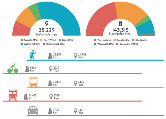 In the 2024 HSC campaign, 500 participants, including students and teachers, enrolled to take part in the High School Challenge initiative. Data from the Play&Go mobile application showed that, during the 13 weeks, they tracked over 25,000 sustainable journeys, covering more than 143,000 sustainable kilometers—of which 4.8% were by bike and another 13.4% walking, which are zero-impact means of transportation (see Figure 1 and Figure 2). The data are aligned with the 2023 results, where participants tracked 34,170 trips (53.9 per person in 2023 vs. 50.49 in 2024) for a total of 143,315 sustainable kilometers. For a graphic representation of the data, see Figure A4 and Figure A5 in Appendix A.