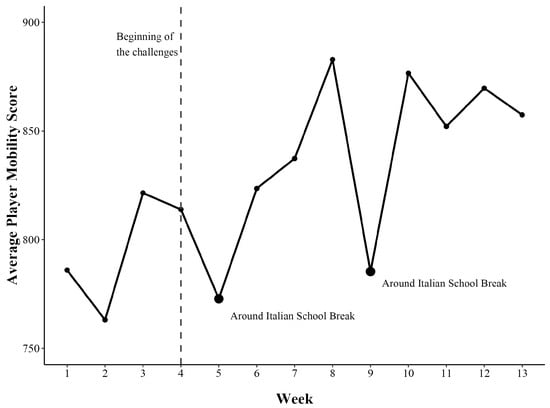 To assess how challenges can enhance people’s participation and retention in the sustainable mobility campaign, we first visualized weekly trends in players’ Mobility Scores. As shown in Figure 3, the average player score increased following the introduction of challenges in Week 4. While temporary drops in engagement were observed around Weeks 5 and 9, corresponding to Italian school holidays, the overall trend suggests a positive effect of the challenges on sustainable choices. See Appendix A Figure A6 for the plot representing the average Eco-Leaves, which follows a similar trend.