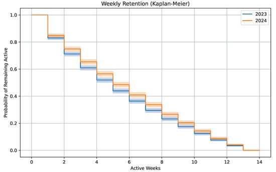To complement these visual trends with more robust statistical comparisons, we conducted a survival analysis comparing the 2023 and 2024 cohorts. The analysis was performed using JupyterLab (version 4.0.11), modeling retention as a time-to-event process in which the event of interest is user disengagement. Each participant was considered at risk of disengagement each week, and the survival probability reflects the likelihood of continued participation over time. A Kaplan–Meier estimator [50] was used to estimate weekly retention probabilities, treating each active week as a survival event. As shown in Figure 5, participants in the 2024 campaign showed higher retention rates than those in 2023. The difference between the survival curves was found to be statistically significant according to the log-rank test (), indicating that the 2024 campaign produced longer-lasting engagement.