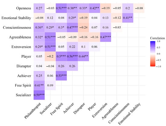 The descriptive statistics and boxplot representing the distributions of each of the Big Five Personality Traits and HEXAD Player Types are reported in the Appendix A (Table A2, Figure A7 and Figure A8). Among the Big Five traits, Conscientiousness (, ) and Openness (, ) displayed the highest mean scores, whereas Emotional Stability (, ) was the lowest. This suggests that participants tend to see themselves as organized and open to new experiences but report lower levels of emotional resilience.