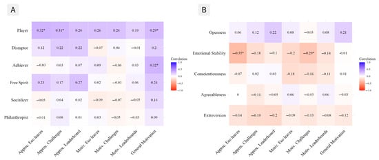 For RQ2 and RQ3, we examine the role of individual differences—namely, HEXAD Player Types and Big Five Personality Traits—in shaping user engagement and responses to specific game elements, including challenges, Eco-Leaves, and leaderboards. These associations were investigated through Pearson correlations, allowing us to identify patterns between motivational/psychological traits and subjective user evaluations and appreciation scores.