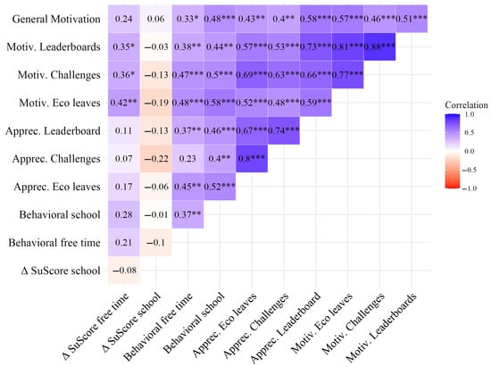 Finally, to address RQ4, we assess how behavioral indicators are related to participants’ motivational profiles and overall evaluations of the campaign. We use correlational analyses to explore these associations and identify whether higher appreciation or motivation is linked to more sustainable behavior during the campaign.