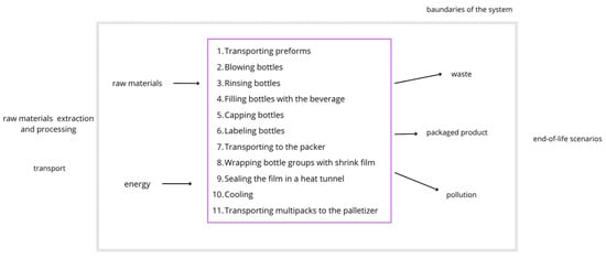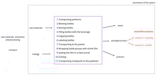 The aim of this research is to comprehensively compare the environmental impact of the technological system covering the key stages of the beverage bottling and packaging process, including the following stages: transporting preforms, blowing bottles, rinsing bottles, filling bottles with the beverage, capping bottles, labeling bottles, transporting to the packer, wrapping bottle groups with shrink film, sealing the film in a heat tunnel, cooling and transporting multipacks to the palletizer. By conducting a detailed environmental analysis, it will not only be possible to determine the total environmental impact of the entire system, but also to indicate the most energy-intensive and emission-intensive stages, which can become the target of optimization activities towards increasing the efficiency and sustainability of production. As part of this work, two variants of the technological system were compared to determine how its environmental harmfulness changed depending on the type of film used and the type of bottles. In the next stage, the post-consumer management scenarios of these two elements were analyzed, comparing the impact of the entire system in the case of landfill and recycling. This analysis allows for the assessment of which approach generates a lower environmental burden and to what extent the method of waste handling affects the final ecological balance of the process. This study was based on four stages of life cycle analysis, which are described in the further parts of this study in accordance with the guidelines of the standards ISO 14040 [21] and 14044 [22].