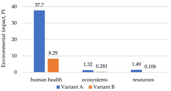 The overall impact on the environment for each of the variants considered results, to the greatest extent, from the burdens associated with the potential impact on human health. This means that of all the impact categories assessed, it is health aspects—such as exposure to toxic substances, air pollution or emissions of harmful chemical compounds—that have the largest share in the overall impact of a given scenario on the environment (Figure 3).