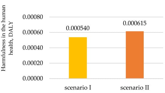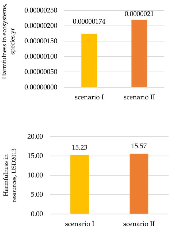 As shown in Figure 4, scenario I is characterized by a lower level of harmfulness in terms of impact on human health—this value is lower by about 0.000075 DALY compared to the alternative scenario. A similar trend is observed in the category of impact on ecosystems, where the difference is about 0.00000045 species.yr, and in the category of resources, where a reduction in environmental costs by about 0.34 USD is noted. This indicates a clear advantage of the scenario with recycling in terms of reducing the negative impact on the environment.