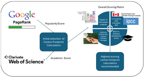 A combined qualitative and quantitative approach was used to answer the main research questions in this study. Qualitative analysis was used to create the main comparative frameworks in this study and quantitative scoring was then used to evaluate the performance of the selected carbon calculator tools within these frameworks in regard to two critical aspects: (1) its compatibility with the Canadian NIR, and (2) its potential to inspire lifestyle changes for the reduction of personal carbon footprints. Prior to a comparison of the calculators, an essential first step was the selection of the calculators to be analyzed in the study. This was conducted using a mixed methodology, combining online rank-based sorting algorithms, as well as previously published academic scoring matrices, to yield the most highly ranked calculators. Figure 1 summarizes the workflow of the study. The scoring scales for all the criteria in this study were fixed at 0–3, in order to ensure comparability with the seminal academic works used to select the calculators.