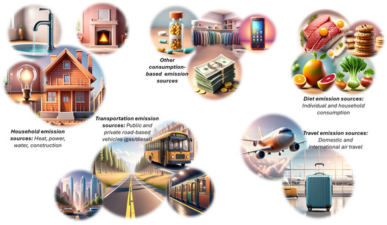 Definitions of typical personal lifestyle activity categories for grouping of emission outputs from carbon footprint calculators (illustrations in the figure are original images generated using the Apple Image Playground application [24]. For illustrative purposes only).