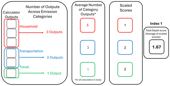 Scoring workflow for Index 1 (depth score) for a given carbon footprint calculator analyzed in this study. The number of outputs is converted into scaled scores between 0 (no outputs in a given category) and 3 (number of outputs > category average + 1.0) to arrive at the total depth score.