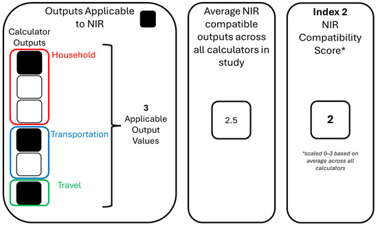 This index was developed to determine which calculators had the highest number of output values that were directly relatable to any single emission sector, as reported in the Canadian NIR. Briefly, these sectors are defined based on the IPCC guidelines and include energy, agriculture, Industrial Processes and Product Use (IPPU), Waste, and the Land Use and Land Use Change and Forestry (LULUCF) sectors. The energy sector further consists of Stationary Combustion, transport, and Fugitive sources [23]. To analyze this, the individual calculator emission output values outlined for Index 1 were used and each output was assessed to see if it could be directly associated with one of the emission sectors in the NIR. Following this evaluation, each calculator was again scored on a scale of 0–3, based on the average number of compatible outputs across all of the calculators. A calculator was awarded 3 points if the number of compatible outputs was over the average, 2 points if it was equal to or within ±1.0 of the average, 1 point if it was below the average, and it was awarded 0 if there was no relevant output data (Figure 4).