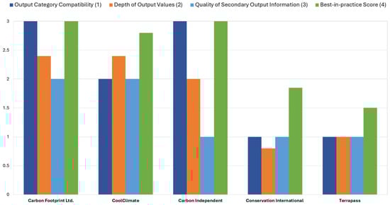 Subsequently, the scoring of the calculators based on the average output values in each category showed that Carbon Footprint Ltd. and Carbon Independent had the same depth score. This was due to the differing number of outputs for each calculator across the evaluation categories (Table 5).