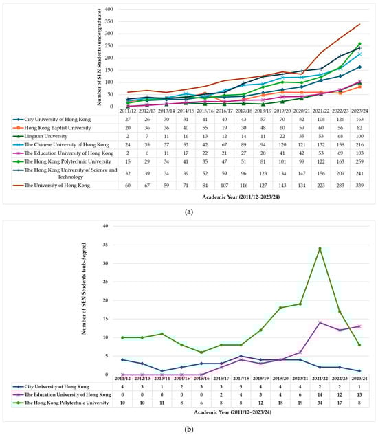 (a) Distribution of the number of SEN students in UGC-funded universities (undergraduate); (b) distribution of the number of SEN students in UGC-funded universities (sub-degree). Note: The charts were created based on the Hong Kong Government’s open data, retrieved from https://data.gov.hk/en-data/dataset/hk-ugc-ugc-student-sen-statistics on 23 May 2025.