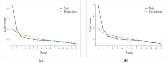 (a) Scree plot of 16 items of Career Maturity Inventory; (b) scree plot of 14 items of Career Maturity Inventory.