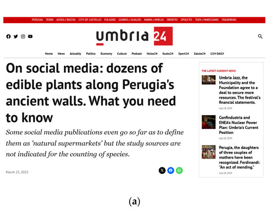 (a) Close-up and (b) first page of the one of the newspaper articles detailing the edible plant species colonising the ancient medieval walls of Perugia—sometimes referred to on social media as ‘hanging gardens’ or even ‘natural mini supermarkets’—from: “Sui social: decine di piante commestibili lungo le mura antiche di Perugia. Cosa c’è da sapere” (Umbria 24, 25 March 2025). Photogrpher: Fabrizio Troccoli.