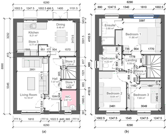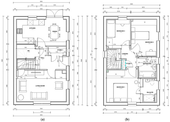 Figure 1a,b show the front and rear elevations of TFH, respectively, while Figure 2a,b show the front and rear elevations of eHome2. Both are three-bedroom detached houses, including a kitchen diner, living room, bathroom, ensuite, toilet and three bedrooms, designed to meet the UK’s anticipated FHS. The floor plan provided modellers with the necessary resources to create DTS models for TFH (Figure 3a,b) and eHome2 (Figure 4a,b). Please refer to the Supplementary Files for more detailed geometric information (Tables S1–S3), comprehensive elevation plans (Figures S2 and S3), and window dimensions (Tables S4 and S5).