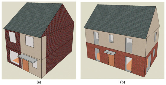 Figure 5 shows the DTS model rendered in DesignBuilder replicating the TFH and eHome2. Table 1 presents a detailed breakdown of the defined thermal zones, illustrating that the total floor area measures 88.49 m2 for TFH and 86.64 m2 for eHome2. In contrast, the SAP calculations indicate a total floor area of 92.82 m2 for TFH and 91.26 m2 for eHome2. This discrepancy arises from the DesignBuilder model’s inclusion of cupboards, storerooms, and internal partitions in its calculations. Additionally, for SAP calculations, the ground floor ceiling height is 2.39 m in TFH and 2.32 m in eHome2, while on the first floor, it is 2.69 m for TFH and 2.61 m for eHome2. For DesignBuilder, it has the same ground floor ceiling height with SAP but for the first floor it is 2.35 m for TFH and 2.30 m as the internal floor thickness (0.34 m for TFH and 0.31 m for eHome2), which was taken into account. The roof pitch is 35 degrees for TFH and 45 degrees for eHome2.