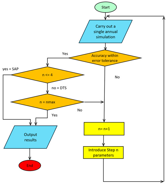 Table 7 outlines the calibration steps, including the in situ measurement updates for steps 2–4 and the modelling details updates for steps 5–8. Calibration steps 1–4 were conducted for both DesignBuilder (DTS) and SAP models, while steps 5–8 were carried out solely for DesignBuilder (DTS) models. Figure 6 serves as a visual flowchart summary of the overall calibration workflow. After each simulation, model accuracy is checked against the error tolerance. If not met, additional modelling parameters are introduced, and n (the calibration step) is incremented. Calibration ends when tolerance is achieved or n reaches its maximum value (nmax). Results are then output.