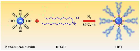 The preparation method is shown in Figure 1, a total of 6 g of hydrophilic spherical nano-silica were dispersed in 150 mL deionized water by high-speed stirring for 10 min, followed by ultrasonication for 20 min, to obtain a homogeneous suspension. The dispersion was then transferred to a three-neck flask and heated in a water bath at 80 °C. Under vigorous stirring and a nitrogen atmosphere, 9 g of DDAC was added dropwise at a constant rate, and the reaction was allowed to proceed for 4 h. The resulting product was collected by centrifugation, dried, and milled to afford a white powder [33,40].