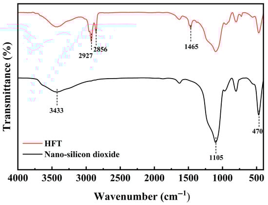 Figure 2 presents the FT-IR spectra of nano-silica before and after modification. The unmodified nano-silica exhibits a broad hydroxyl (–OH) stretching band at 3433 cm−1 and characteristic Si–O–Si asymmetric stretching and bending bands at 1105 and 470 cm−1, respectively. After modification, the HFT spectrum retains the Si–O–Si peaks at 1105 and 470 cm−1, whereas the –OH band at 3433 cm−1 is significantly attenuated, suggesting partial shielding or replacement of surface silanol groups by the quaternary ammonium salt. New –CH2– asymmetric and symmetric stretching bands emerge at 2927 and 2856 cm−1, respectively, accompanied by a –CH2– bending band at 1465 cm−1, all arising from DDAC’s long alkyl chains. These changes confirm the electrostatic adsorption of didodecyl dimethyl ammonium cations onto the silica’s silanol sites, forming a hydrophobic organic shell and yielding the target product HFT.