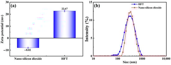 Zeta potential and particle size distribution were measured with a Malvern Zetasizer Nano ZS, and the results are presented in Figure 3. In Figure 3a, unmodified nano-silica dispersed in water exhibits a negative surface charge, with an average zeta potential of −8.02 mV (absolute value less than 15 mV), indicating electrostatic instability. After modification, HFT’s zeta potential shifts to +22.67 mV, confirming that quaternary ammonium cations have coated the SiO2 surface, thereby enhancing electrostatic repulsion and stabilizing particle dispersion [33,40]. The strong positive charge further promotes HFT adsorption onto negatively charged shale and clay surfaces, improving its inhibition performance.