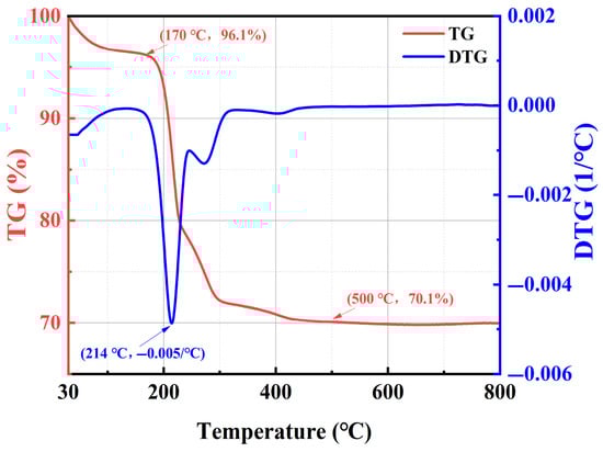 Figure 4 displays the TG and DTG curves of HFT. From 30 to 170 °C, the sample loses only 3.9 wt%, corresponding to desorption of physically adsorbed water and light volatiles, and indicating negligible thermal degradation below 160 °C under typical deepwater conditions. As the temperature rises from 170 to 214 °C, the DTG trace shows a pronounced negative peak (−0.005 wt%/°C), and the TG curve undergoes a sharp mass loss, completing near 214 °C, which marks the decomposition of DDAC alkyl chains on the SiO2 surface. Beyond this range, the TG curve levels off, stabilizing at approximately 70.1 wt% by 500 °C, confirming that the remaining mass is the thermally robust silica framework. Overall, HFT exhibits outstanding thermal stability up to 160 °C—satisfying the broad-temperature requirements of deepwater drilling—and the distinct mass-loss event between 170 and 214 °C verifies successful DDAC loading onto nano-SiO2.