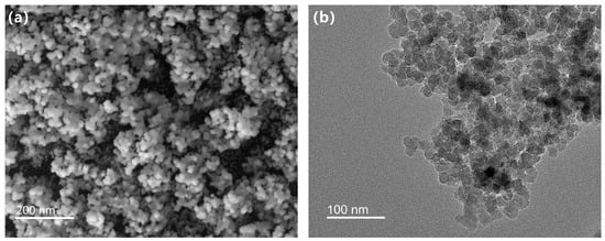 Figure 5 depicts the microstructure of HFT. The SEM image (Figure 5a) shows nearly spherical particles forming a loosely clustered network via point contacts, with pronounced interparticle porosity and a uniform spatial distribution. The TEM micrograph (Figure 5b) reveals a thin, lower-contrast organic layer surrounding each nanoparticle, corresponding to the DDAC coating. These observations confirm that the modification preserved the original particle size while generating a uniform organic shell, providing the morphological foundation for subsequent collapse-resistance testing.