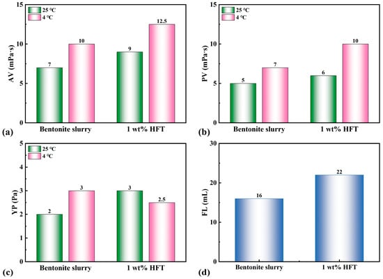 As shown in Figure 6, a 4 wt% bentonite slurry exhibits an apparent viscosity (AV) of 7 mPa·s, a plastic viscosity (PV) of 5 mPa·s, and a yield point (YP) of 2 Pa at 25 °C; under low-temperature conditions (4 °C), these values increase to 10 mPa·s, 7 mPa·s, and 3 Pa, respectively. Introducing 1 wt% HFT produces only minor changes: at 25 °C, the AV, PV, and YP shift to 9 mPa·s, 6 mPa·s, and 3 Pa, whereas at 4 °C they reach 12.5 mPa·s, 10 mPa·s, and 2.5 Pa. All parameters remain well below the limits commonly specified for deepwater operations (AV ≤ 20 mPa·s; PV ≤ 15 mPa·s), confirming that HFT preserves acceptable rheology at both ambient and low temperatures without compromising pumpability.