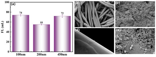 Figure 7 visually demonstrates the nanoscale plugging efficacy of 1 wt% HFT. In the absence of HFT, PTFE membranes with pore diameters of 100, 200, and 450 nm exhibit almost complete filtrate loss within seconds, indicating negligible resistance to flow. Following HFT addition, filtrate volumes decrease significantly, with the 200 nm membrane showing optimal performance (55 mL loss) compared to the 100 nm (74 mL) and 450 nm (72 mL) membranes. This behavior corresponds to the HFT particle-size distribution (58.8–1100 nm), as pore sizes near the median particle diameter (~300 nm) maximize particle bridging and particle–pore-wall interactions. Meanwhile, the surface of the particles is strongly positively charged, which enhances their dispersion stability and is more conducive to sealing the nanopores under different pore sizes.
