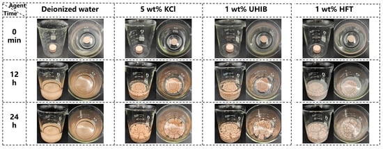 Figure 8 intuitively illustrates the appearance of artificial cores after immersion in various solutions. In deionized water, cores become turbid within 12 h and ultimately collapse, indicating severe bentonite hydration, swelling, and dispersion. In the 5 wt% KCl system, large fragments spall at 12 h, and by 24 h, the core has expanded further and exhibits extensive cracking, showing that ionic suppression alone cannot preserve structural integrity. In the 1 wt% UHIB system, network-like cracks emerge at 12 h and develop into deep fissures with significant spalling by 24 h. By contrast, cores treated with 1 wt% HFT display only fine shrinkage cracks at 12 h and limited block spalling at 24 h, demonstrating HFT’s superior inhibition of bentonite hydration, swelling, and dispersion.
