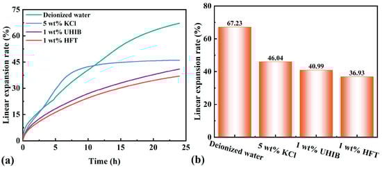 Linear expansion tests were performed with a CPZ-2 dual-channel dilatometer (Qingdao Tongchun, Qingdao, China) to quantify HFT’s inhibition of shale hydration swelling. Artificial cores were placed in the test cylinders and exposed to equal volumes of 1 wt% HFT, 5 wt% KCl, 1 wt% UHIB, or deionized water (control). The axial expansion was recorded continuously over 24 h, and the final linear expansion ratio was calculated to compare each fluid’s efficacy in suppressing bentonite swelling.