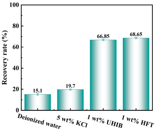 Rolling recovery tests quantitatively assess an inhibitor’s capacity to inhibit shale-cutting hydration and dispersion. As shown in Figure 10, 16 h recovery rates vary markedly. Deionized water yields only 15.1%, with cuttings nearly fully disintegrated. Using 5 wt% KCl increases recovery to 19.7%. Incorporating 1 wt% UHIB raises recovery to 66.85%, demonstrating strong inhibition of hydration and dispersion. The 1 wt% HFT system achieves the highest recovery at 68.65%, more than triple that of deionized water and marginally superior to UHIB. These results confirm that HFT effectively inhibits shale hydration and dispersion, thereby enhancing wellbore stability.