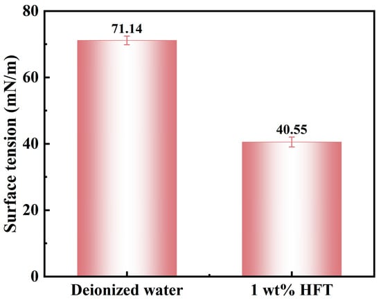 Figure 11 presents a comparison of surface tension between a 1 wt% HFT solution and deionized water. Pure water has a surface tension of 71.14 mN/m, which decreases to 40.55 mN/m upon the addition of HFT—a reduction of 43%. This substantial decrease stems from the oriented alignment of HFT’s double hydrophobic-chain quaternary ammonium ions at the gas–liquid interface, boosting surface activity. Lower surface tension reduces capillary suction at the wellbore, limits filtrate penetration into shale micropores, and thus helps suppress shale hydration and improve wellbore stability.