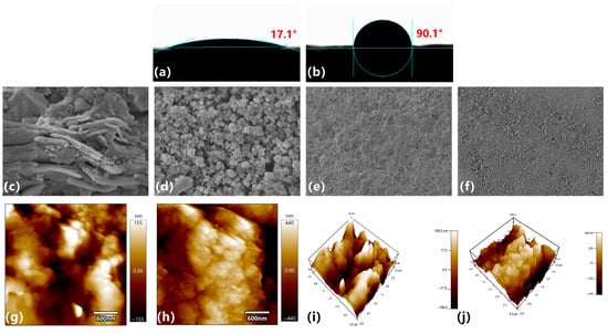 Comparison of shale disks before and after HFT treatment: (a,b) Water-contact angles; (c,d) SEM images, 200 nm scale; (e,f) SEM images, 20 µm scale; (g,h) 2D AFM height maps; (i,j) 3D AFM surface reconstructions.