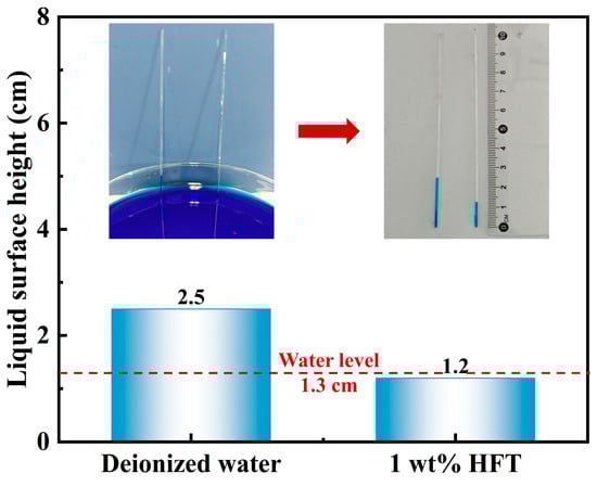 Capillary rise tests visually replicate water infiltration into shale micropores and microfractures under capillary forces. In deionized water (Figure 13), the liquid column rises to 2.5 cm—well above the 1.3 cm reference waterline (red dashed line)—demonstrating continuous hydrophilic capillary suction into shale pores. By contrast, after treatment with 1 wt% HFT, the column height reaches only 1.2 cm, below the reference, indicating a reversal of capillary action from suction to repulsion and a reduction of approximately 52%. This finding shows that HFT markedly suppresses capillary suction in shale pore throats, thereby mitigating hydration-induced expansion from filtrate invasion and further enhancing wellbore stability.