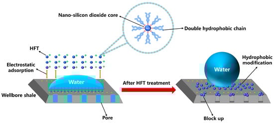 In summary, we functionalized nano-silica with a long-chain hydrophobic cationic surfactant to develop a hydrophobically modified nanoscale collapse-prevention agent (HFT). Performance tests and mechanistic studies demonstrate that HFT stabilizes wellbores through synergistic nanoscale pore plugging, electrostatic adsorption, and wettability reversal, highlighting its strong potential for deepwater drilling applications. The main conclusions are as follows: