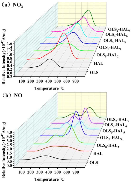 The results of the elemental analysis indicate the presence of nitrogen (N) in both OLS and HAL, albeit in trace amounts. Nitrogen oxides (NO, NO2) and sulfur dioxide (SO2) are typical gaseous pollutants that contain nitrogen. Their release characteristics necessitate close monitoring. As illustrated in Figure 4a–c, the temperature-dependent release curves for NO2, NO, and SO2 are evident.