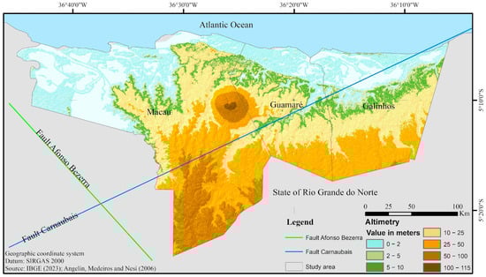 From a geomorphological perspective, the region is characterized by extensive, low-lying coastal plains (Figure 2), with nearly half of the area lying below 5 m in elevation. Although research on Holocene eustatic oscillations in this region remains limited, existing data suggest that the maximum marine transgression reached approximately 5 m around 5100 years BP [18]. Supporting this, fluvial-estuarine sediments identified in Lagoa do Queimado indicate a historical sea level highstand slightly exceeding 4 m [19]. The highest elevations occur in the central part of the study area, where the Serra do Mangue Seco reaches 115 m above sea level. This major landform is classified as a dome with minimal dissection and has been attributed to structural processes associated with fault systems of the Potiguar Rift, with additional influence from the Macau magmatism [19,20,21,22]. Other elevated surfaces in the study area primarily consist of coastal tablelands.