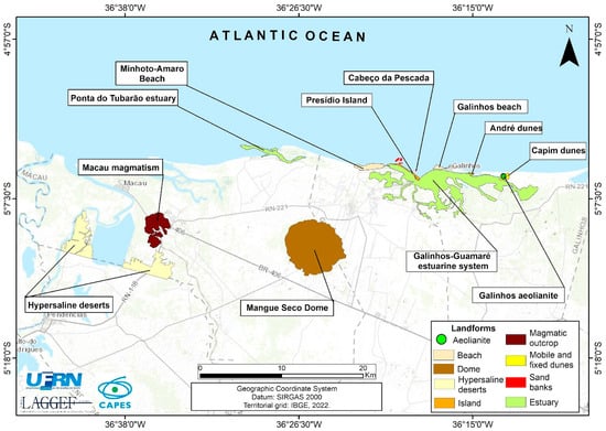 Previous studies on the geomorphological heritage of this coastal region have focused on geosites in the western sector of the Costa Branca [15,23]. The present study shifts attention to the eastern sector of this coastal segment, analyzing 12 geosites that were previously inventoried based on their scientific value, on the relationship between this value and their potential degradation, and on the representation of different types of coastal processes and landforms [24,25]: hypersaline deserts; Macau magmatism; Ponta do Tubarão estuary; Mangue Seco dome; Minhoto–Amaro beach; Presídio Island; Cabeço da Pescada; Galinhos–Guamaré estuarine system; Galinhos beach; André dunes; Capim dunes; Galinhos aeolianite (Figure 3).