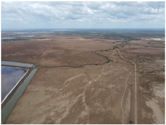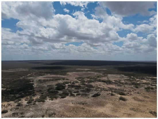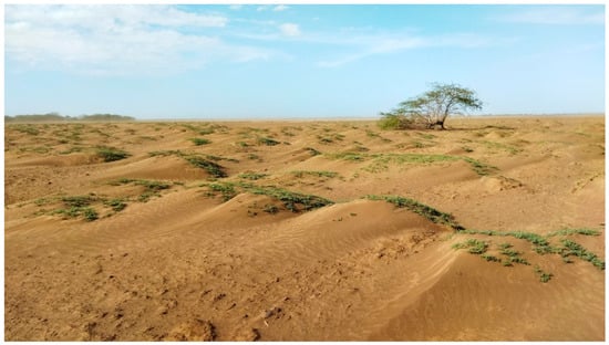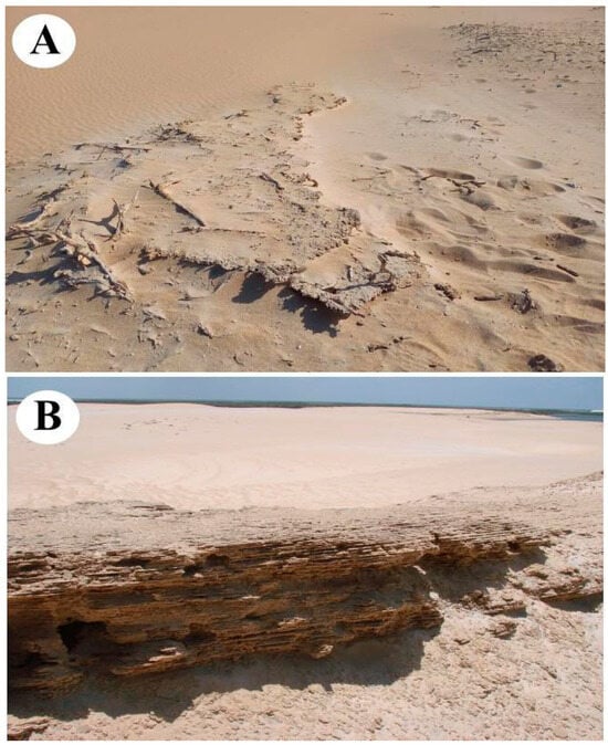 The hypersaline deserts correspond to the inland parts of the extensive fluvial–marine plains of the Piranhas–Açu River delta. Owing to the region’s extremely low topography, these areas are inundated by marine waters during spring tides, which contribute to soil salinization. The absence of a well-developed estuarine environment is attributed to the soil’s impermeability, high evaporation rates, and the low discharge of the rivers in the area [24]. Typical mangrove formations are largely absent, occurring only near the riverbeds. As a result, the landscape exhibits desert-like characteristics, including landforms commonly associated with arid environments, such as dunes (Figure 4).