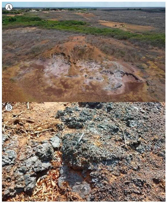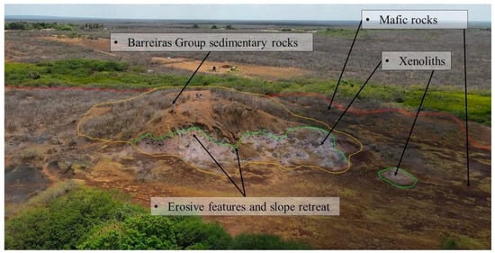 The Macau magmatic outcrop is a low hill (Figure 5) that represents the only occurrence of igneous rocks within the study area. Also referred to as the Macau Basalt, this outcrop comprises a suite of mafic rocks—primarily basalts and diabases—originating from both intrusive activity and volcanic overflows within the Tibau Formation [20]. The formation of these rocks is associated with hotspot activity that occurred during the Eocene and Miocene. The site’s geological significance is heightened by the rarity of volcanic events in the region, due to the tectonic stability of the Atlantic coast of northeastern Brazil.
