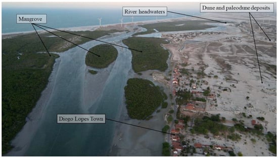 The Ponta do Tubarão estuary is located within a Sustainable Development Reserve, which is a category of protected area in Brazil that supports traditional populations in conserving nature while promoting sustainable development and improving quality of life. This geosite is characterized by its semi-arid estuarine environment, where freshwater recharge—essential for maintaining continuous flow and the mixing of water masses critical to biodiversity—is sustained primarily by hydrogeological processes [24]. Extensive dune fields absorb rainfall during the wet season, and, due to the low permeability of the materials, the water drains slowly, eventually resurfacing and forming rivers near the coastline (Figure 6).