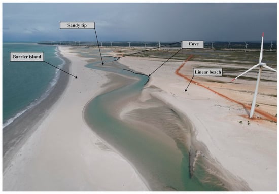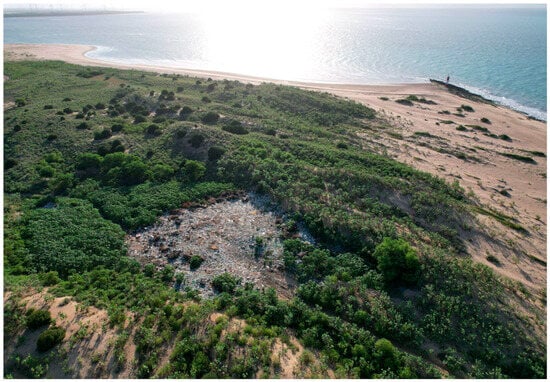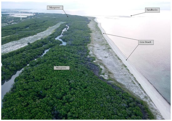 Presídio Island, covering an area of approximately 0.5 km2, is located north of the municipal center of Guamaré. The geosite’s name (from the Portuguese presídio meaning “prison”) originates from a local practice in which residents would take livestock to graze on the island during low tide, effectively isolating them there. Oriented along an east–west axis, the island is composed of Quaternary depositional sediments formed in a wave- and tide-dominated environment [32]. It features a variety of landforms, including sandbanks to the north, a beach ridge, and a mangrove swamp (Figure 9), which collectively contribute to the island’s morphological stability despite continuous tidal and wave influence, resulting in only minor temporal changes.