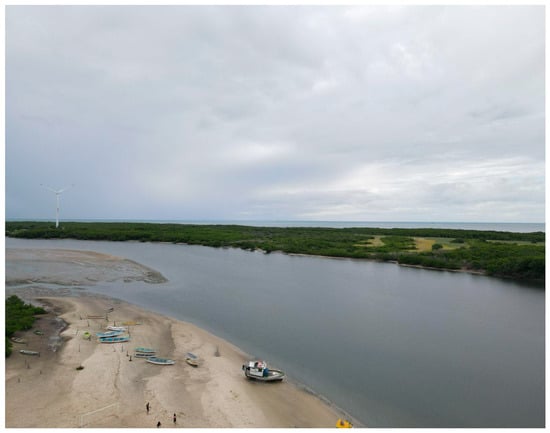 The Galinhos–Guamaré estuarine system is an extensive geosite spanning approximately 35 km2 across the municipalities of Galinhos and Guamaré. It is protected under Brazilian federal legislation [33]. The site encompasses both the estuarine environment and adjacent mangrove swamps (Figure 11). The estuary receives input from a series of predominantly ephemeral rivers, the most notable being the Aratuá, Miassaba, Porto Capim, Camurupim, Pisa Sal, Pratagil, Tomaz, Galinhos, and Volta do Sertão Rivers [34].