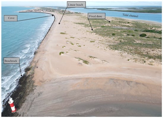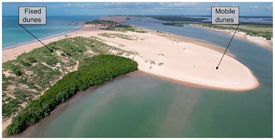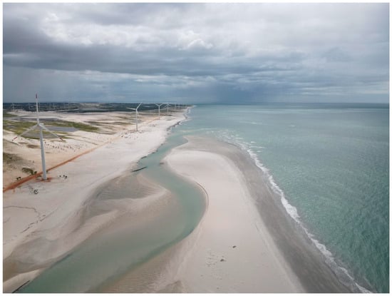The municipality of Galinhos derives its name from the local name for the “rooster” fish (Selene vomer sp.), a small marine fish referred to as Galinhos (“little roosters”) by local fishermen. The beach is morphologically characterized by a 20-m-wide sand strip, followed by a secondary strip measuring 135 m, and a nearshore zone approximately 45 m wide [35].